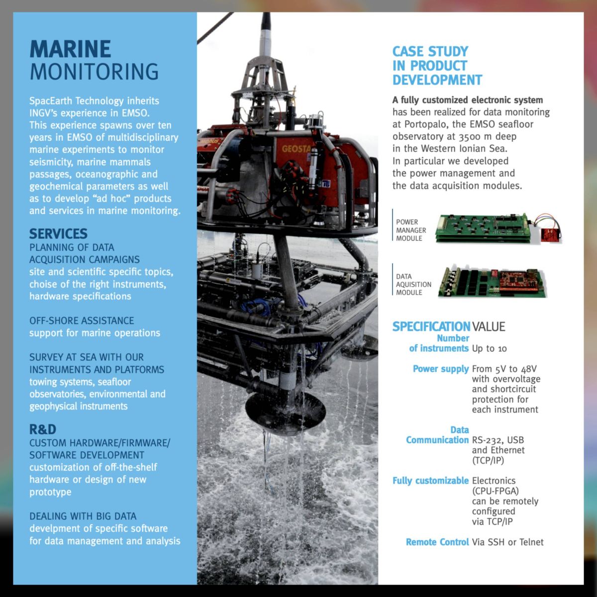 The underwater observatory integrates seismic sensors, acoustic instruments, oceanographic probes and geochemical monitoring systems within a robust seafloor platform capable of operating at depths of up to 7.000 meters.